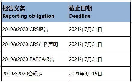 開曼公司/開曼群島FATCA和CRS申報截止日期(2019&2020):